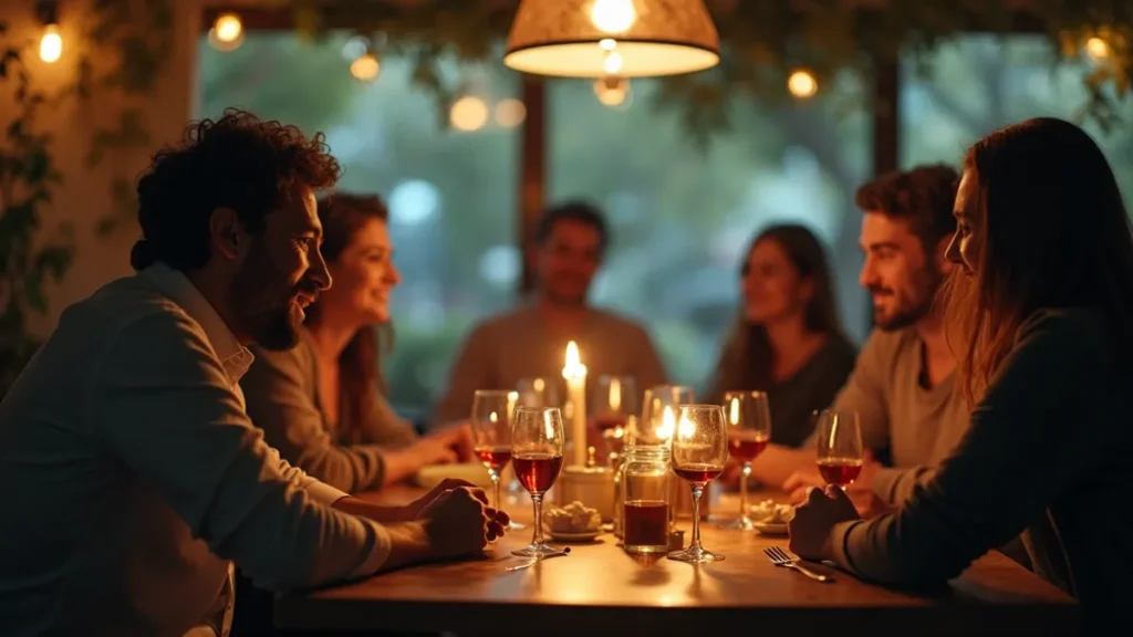 Um grupo de amigos se reúne para um jantar informal. Conversas comuns, bebidas e pequenas tensões do dia a dia aparecem primeiro.